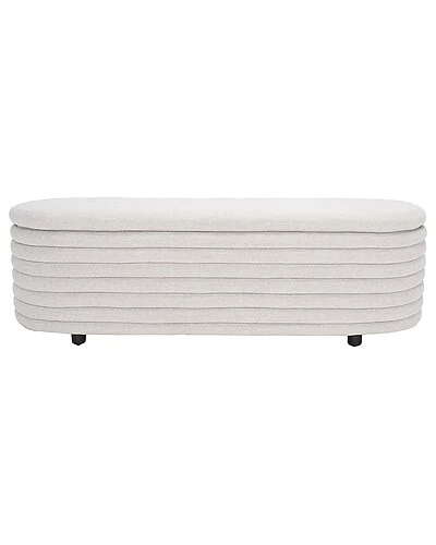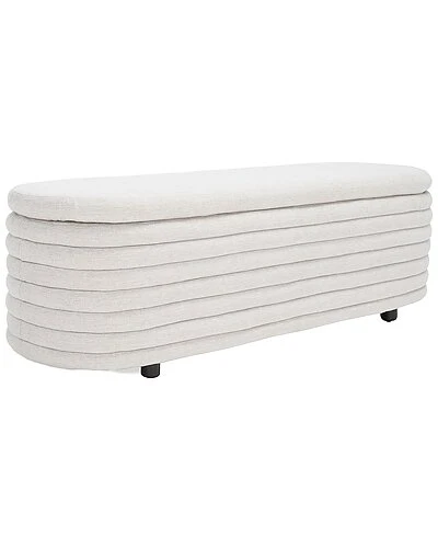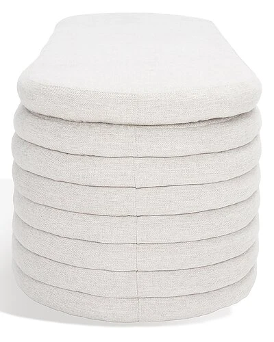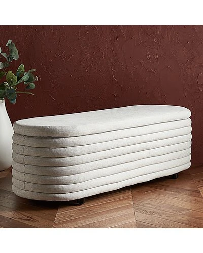 - Bring a dose of style and convenience to your home with the Jaymie storage bench. The modern silhouette of the bench is enlivened with bold, voluminous folds to feature as an artful accent for your home. the graceful bench is softened with sweeping curves at each end to present an oval and comfy seat for any corner of your home. Expertly tailored in linen with birchwood legs, the bench conveniently lifts to store your throws, pillows, and out-of-season clothing in a living room, entryway, or bedroom.