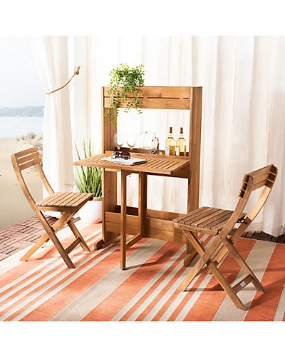 - Design details: Quaint, casual and convenient for spaces large or small, the Barley Flower Shelf 3 PC Bistro Set transforms leisure living spaces into outdoor getaways. Easy setup, easy fold-away storage, the Barley Bistro set comes with matching wooden chairs and a handy table-shelf, made from teak and eucalyptus.
