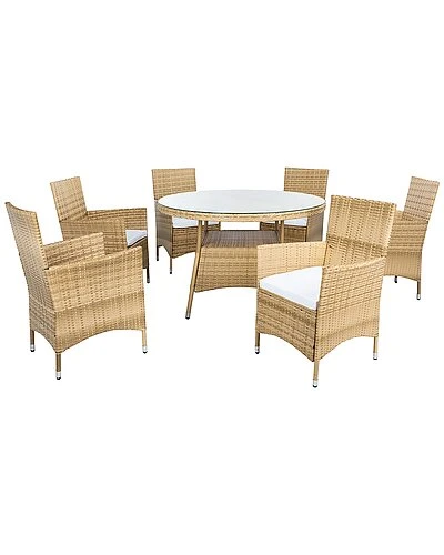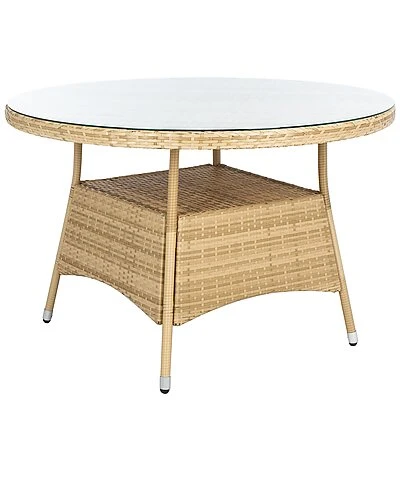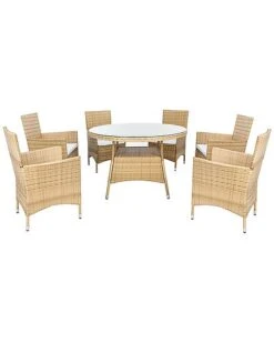 - This Challe Dining Set elevates outdoor entertaining with substance and style. Challes six ultra modern chairs are given additional depth and intrigue with woven natural wicker, pairing perfectly with its round glass topped dining table. Soft white seat cushions ensure comfortable hours in the great outdoors.