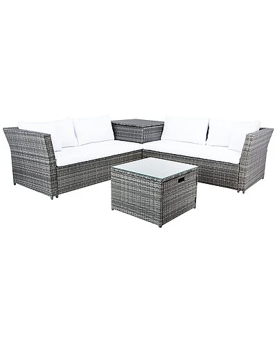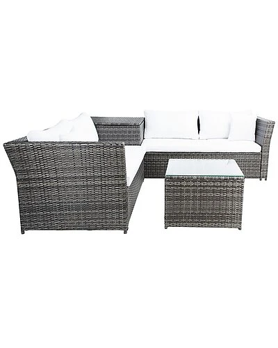 - Entertaining is made effortless and storage is made simple with this Helga Outdoor Living Set. Designed with sleek, subtle angles and plush grey cushions, Helga complements a myriad of decorating styles with its grey woven frames. Designers love its smart hidden storage.