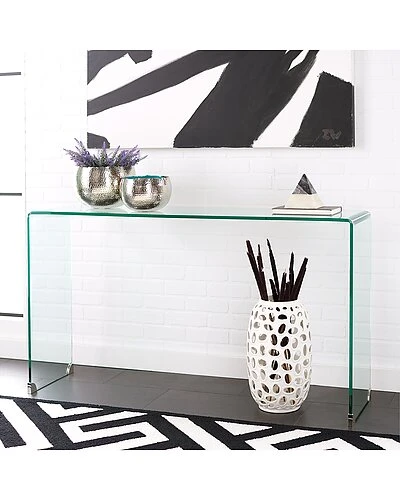 - Make a dramatic modern statement in the entry or living room with this stunning Huck Console Table. Elegantly ethereal, Hucks rounded corners soften its stark lines, and its clear glass seamlessly accents any rooms color scheme.