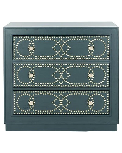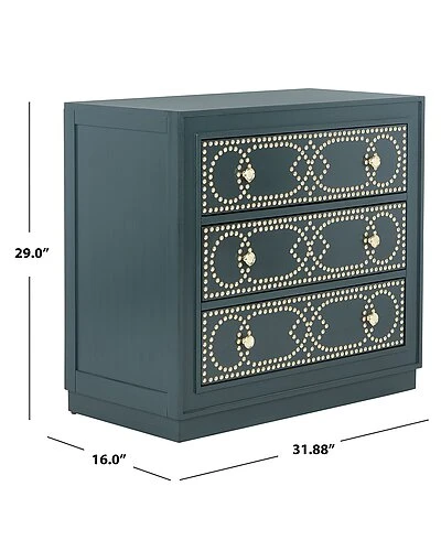 - Add designer style to the bedroom with this modern 3 drawer chest. Inspired by the work of master artisans, its intricate gold nailhead design and deluxe gold handles, complements its steel teal finish. Generous storage makes it a contemporary classic.