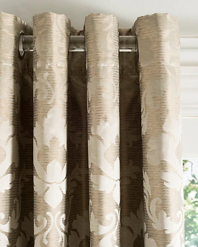 - Design details: The Perama Window Panel turns stately-chic style into contemporary window fashion in the shimmering, tonal design and expressive mod color of this striking window curtain. Evocative damask motifs, in a vibrant shade of beige, play beautifully against the iridescent luster of the wrinkle-resistant, sun-resilient synthetic fabric panel. Finished with a silky soft, blackout liner for complete privacy and shading of the sun. Finished with polished metal grommets for easy installation.